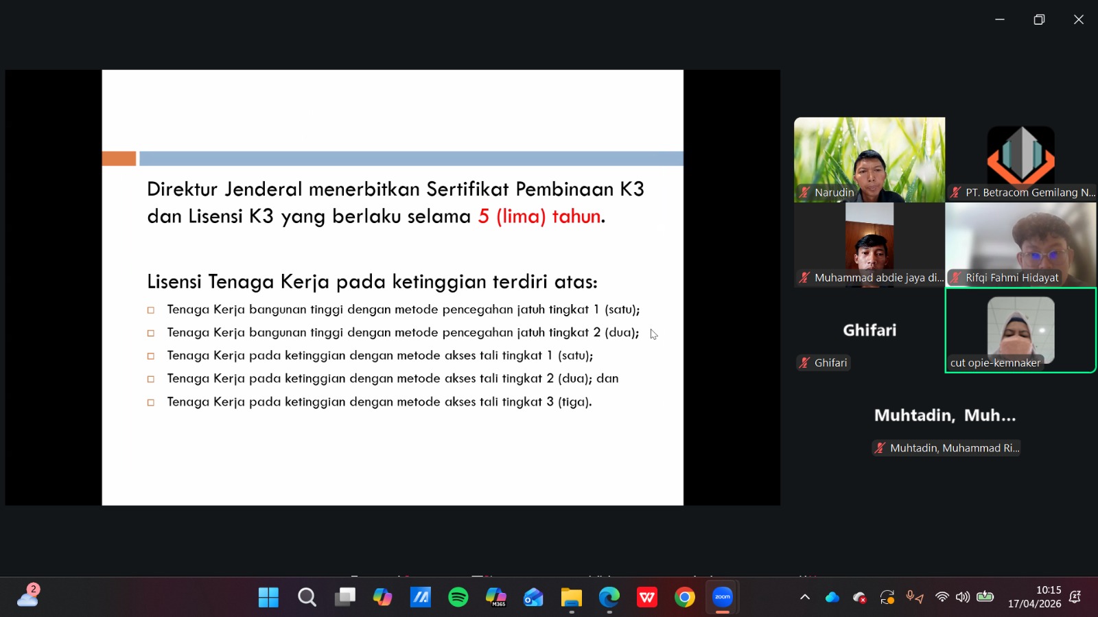 Selamat dan Sukses Atas Terlaksananya Training Tenaga Kerja Pada Ketinggian Tingkat 1 (TKPK-1) Sertifikat Kemnaker RI, Pada Tanggal 13-17 April 2026 Dilaksanakan Secara Blended Training di Betracom Arena Training Center Bogor dan Seluruh Peserta Dinyatakan LULUS.
