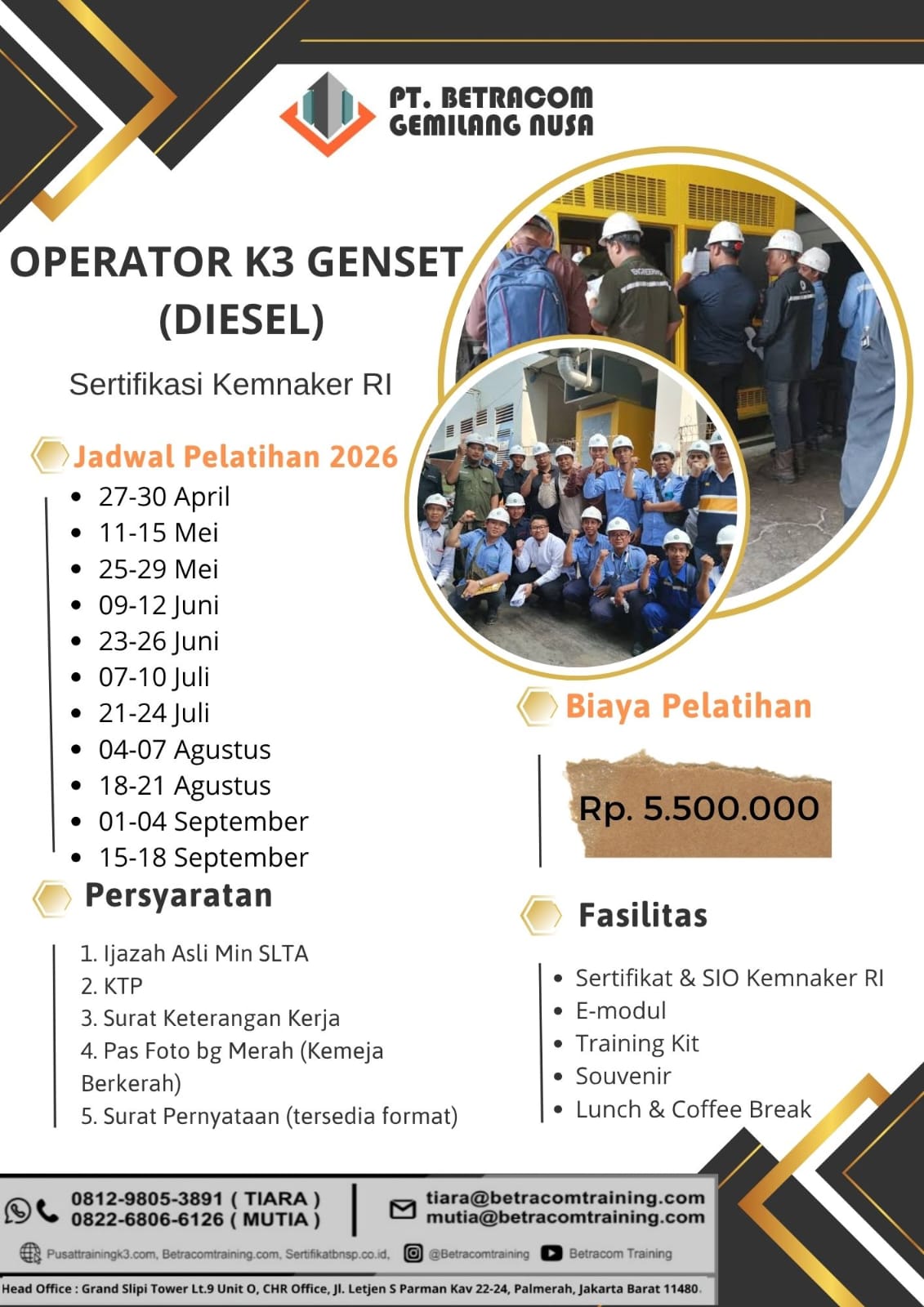 Dengan semakin bertambah lajunya kemajuan zaman di bidang teknologi terutama di bidang perindustrian, penggunaan mesin genset atau diesel adalah suatu hal yang mutlak ada. Namun dalam pengoperasiannya, mesin genset atau diesel mengandung potensi hazard atau bahaya yang tidak bisa dibilang kecil yang dapat menyebabkan kecelakaan besar, yaitu ledakan dan kebakaran. Untuk itu perlunya antisipasi sejak dini dalam rangka menangani bahaya tersebut, yaitu dengan diadakannya pelatihan bersertifikasi untuk para operator genset, yang mencakup cara-cara mengoperasikan mesin genset yang benar sesuai SOP, undang-undang tentang pesawat tenaga produksi, serta point-point safety atau k3 genset atau diesel yang harus diketahui dan dikuasai oleh para operator genset.